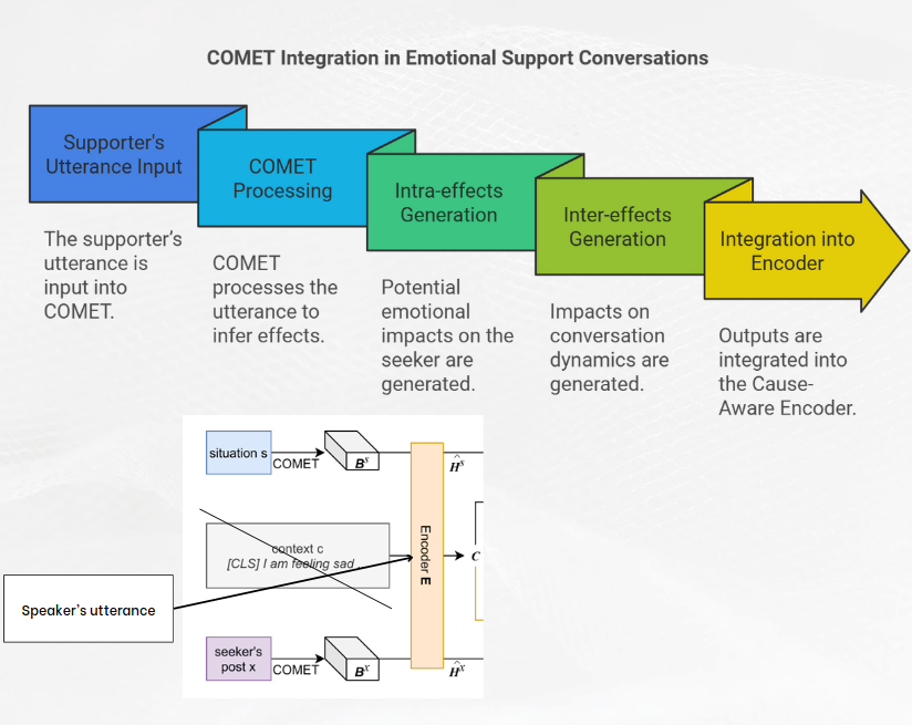 - COMET Integration – Instead of simply analyzing conversation context, CauESC feeds supporter utterances into COMET to generate causal inferences about emotional outcomes.